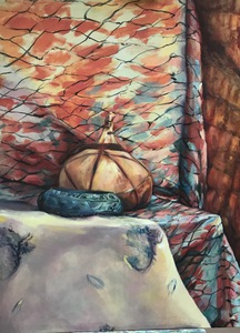 2015een landschap van een roze kleed uit Tanzania en handgemaakte schaaltjes uit Japan die een gesprek met elkaar aangaan